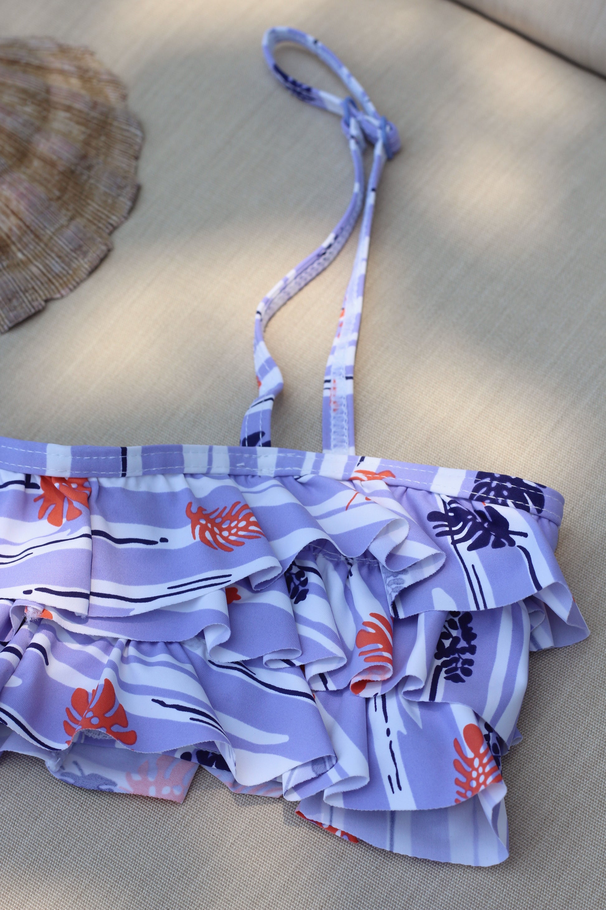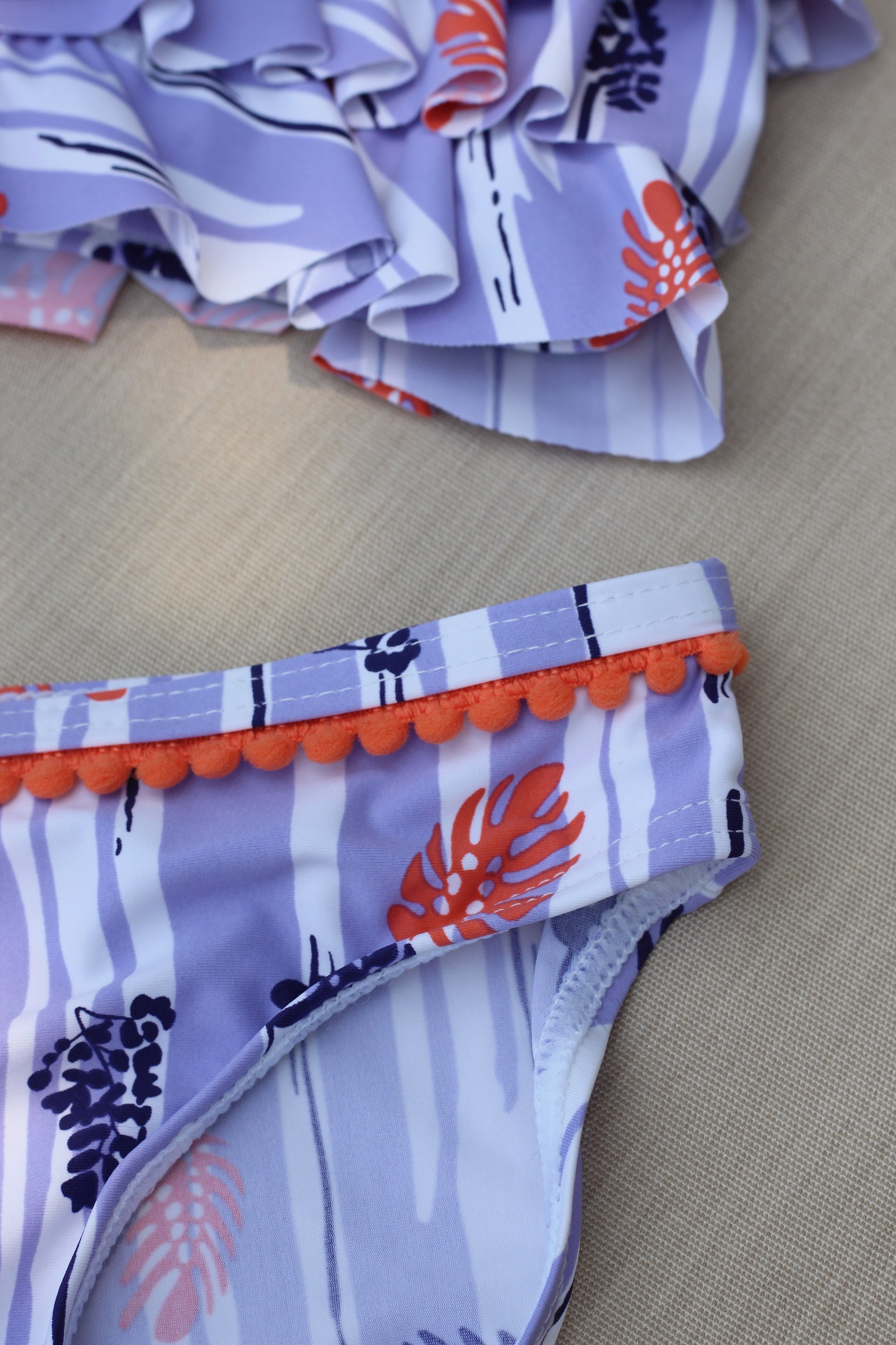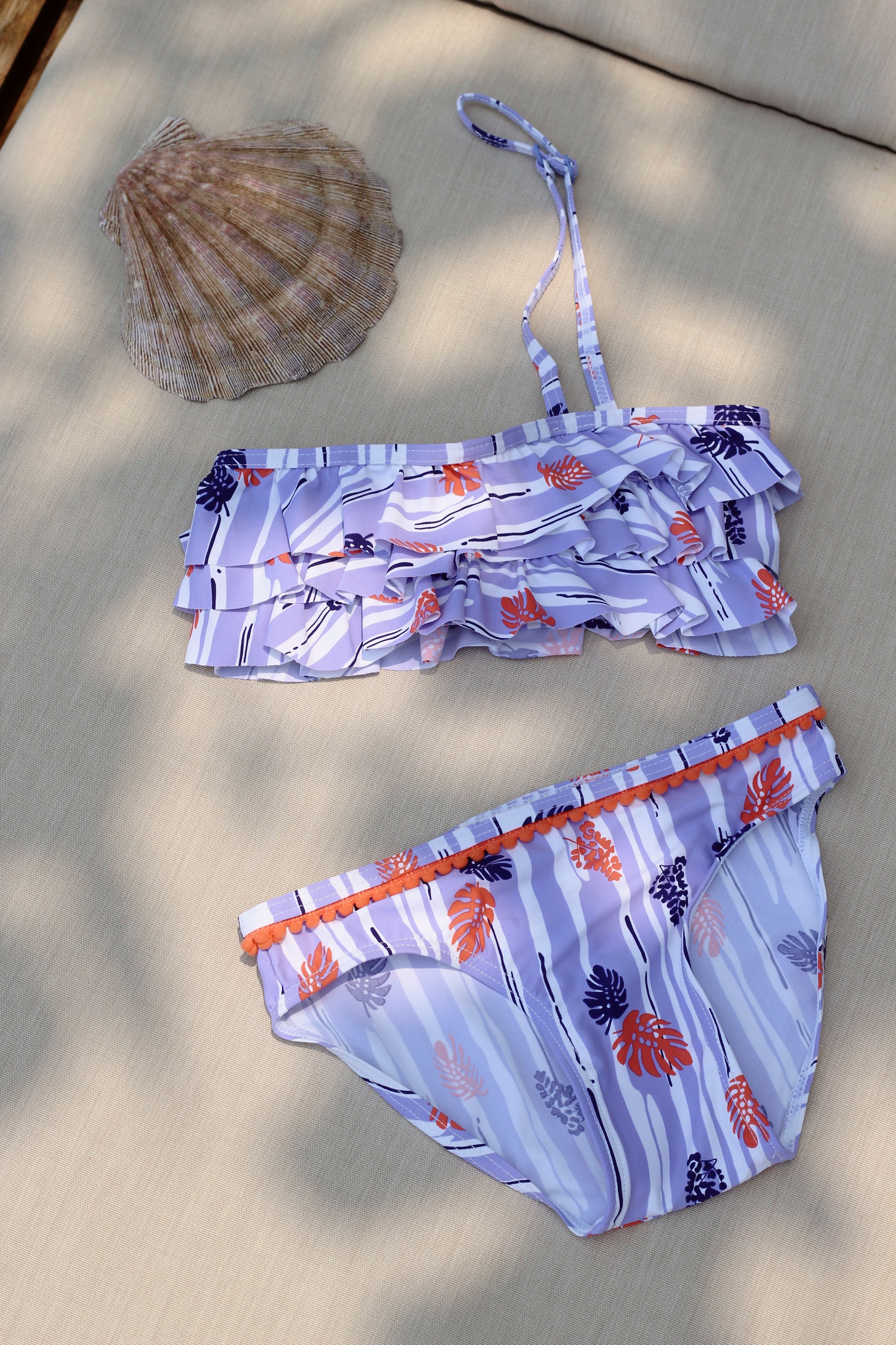 Bañador de dos piezas para niña con estampado en morado y naranja y detalle de olanes al frente