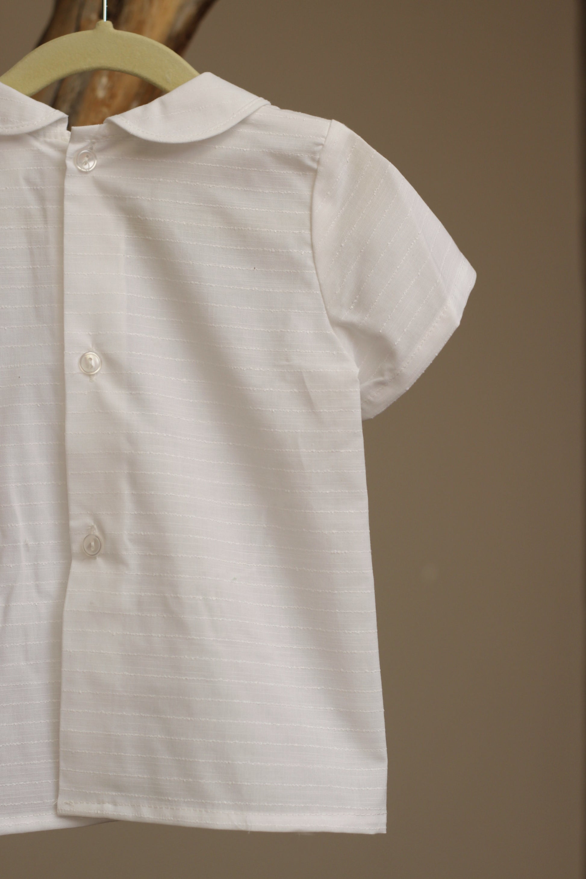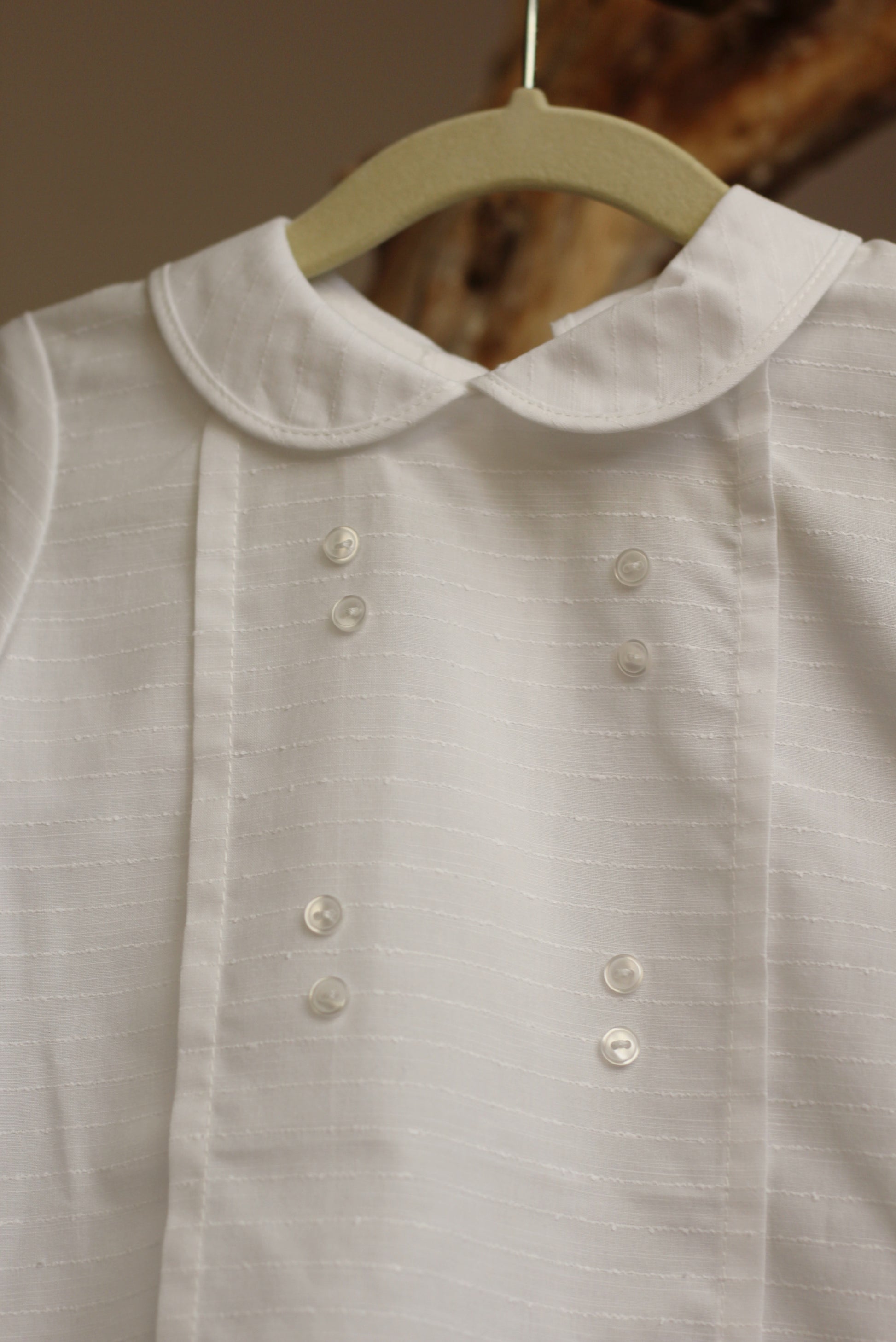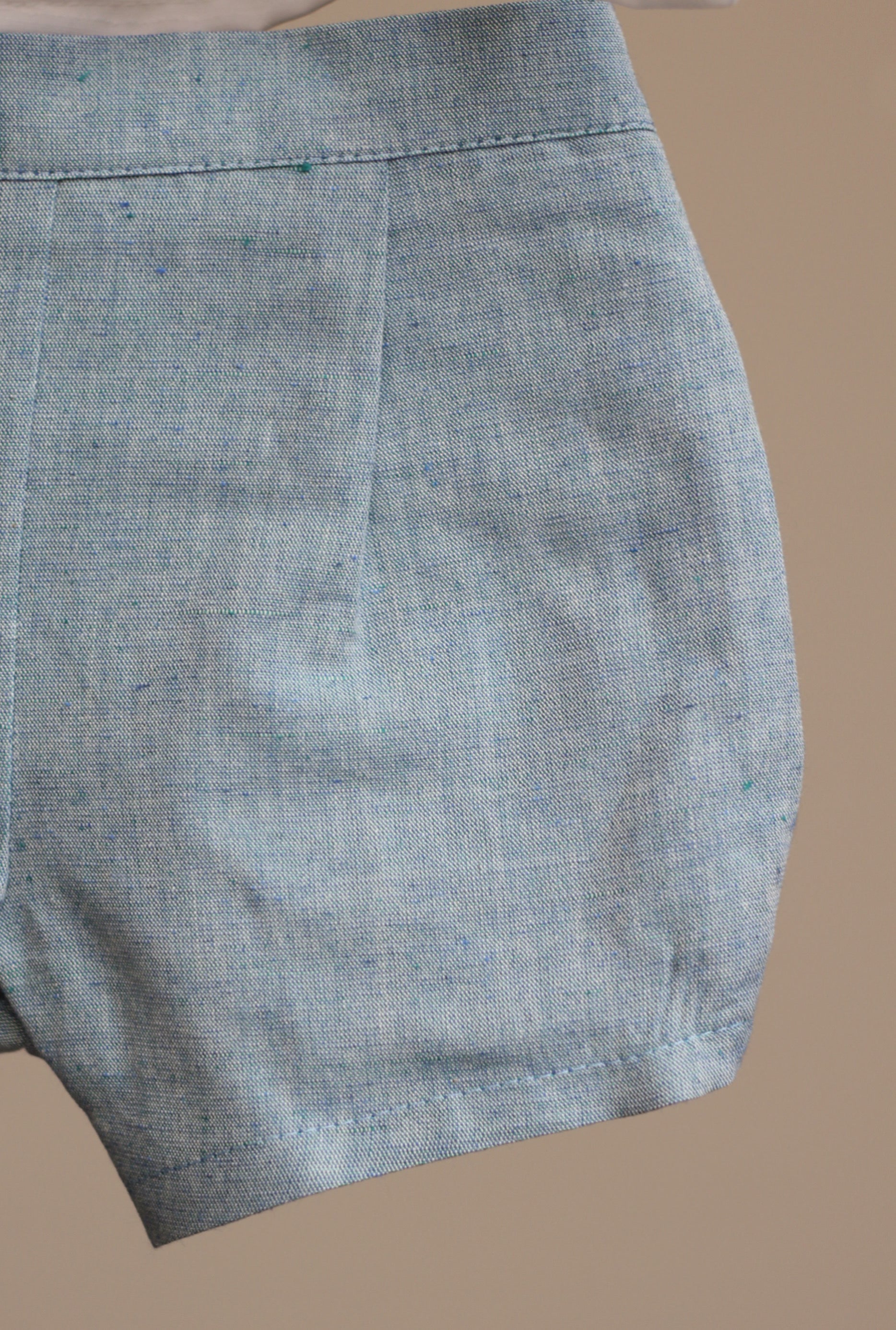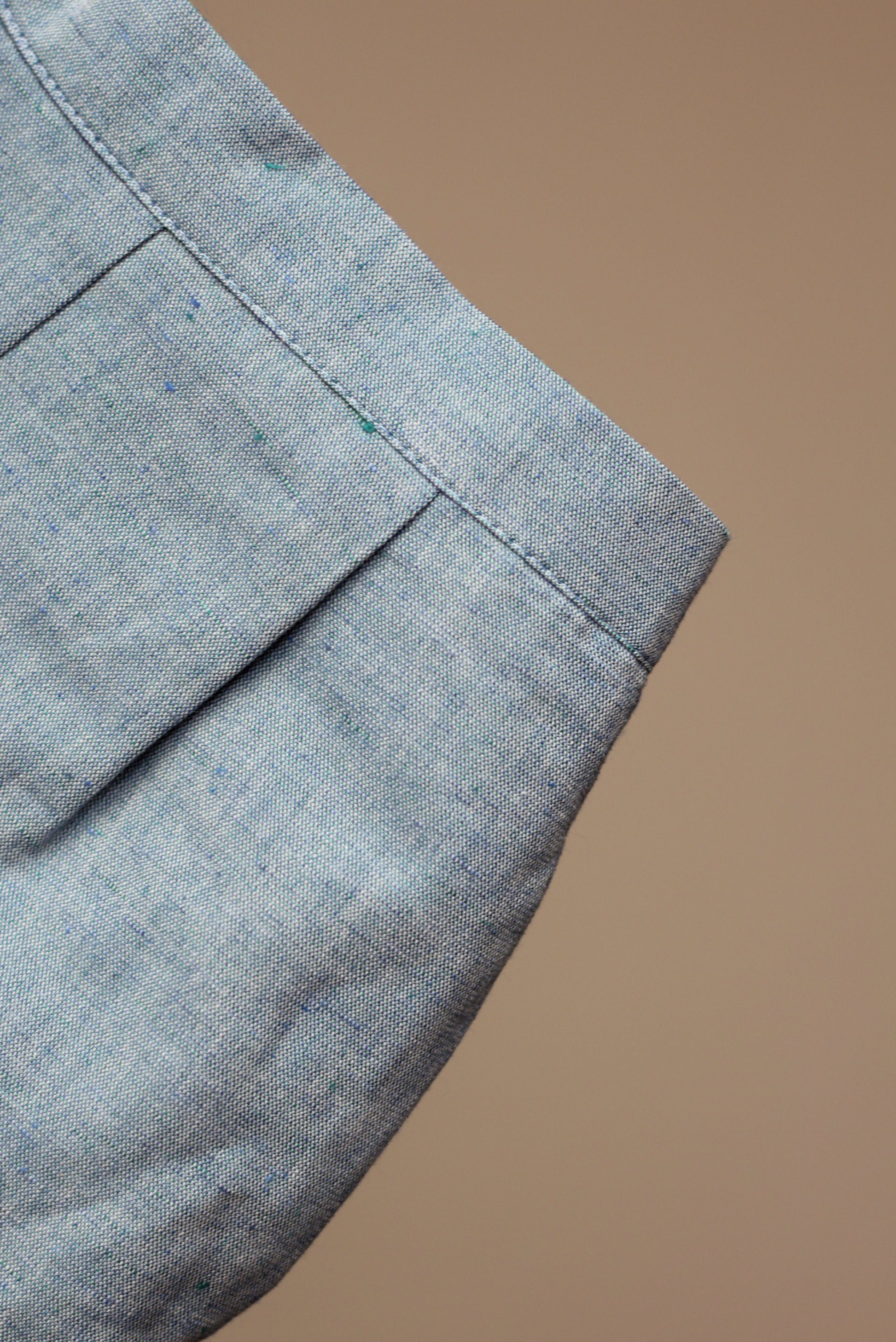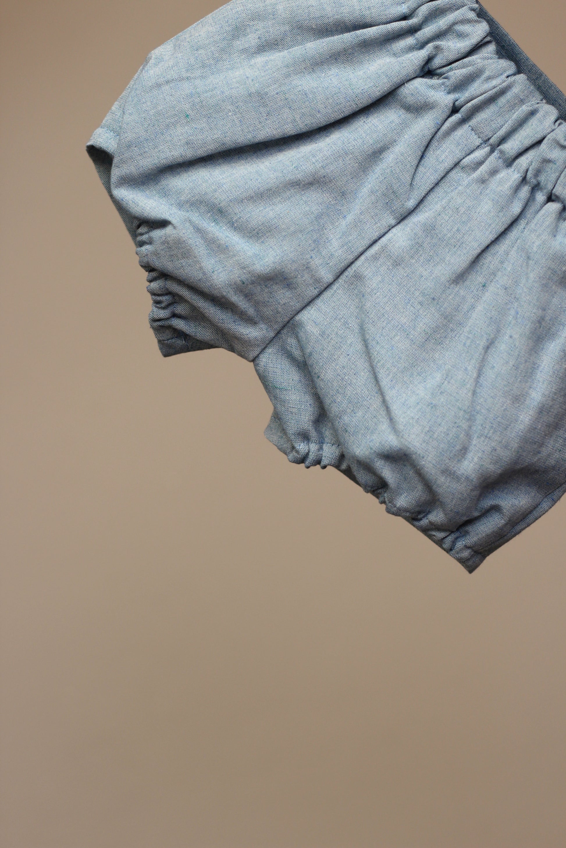 Conjunto compuesto de dos piezas: camisa y pantalón de tela tipo lino en tono azul.