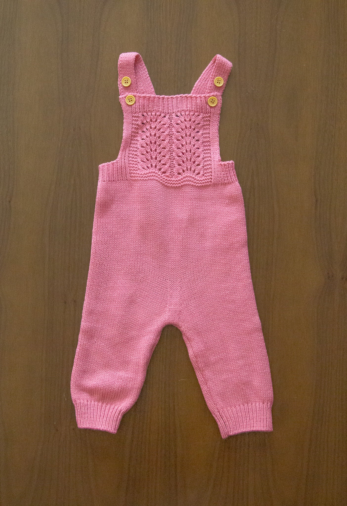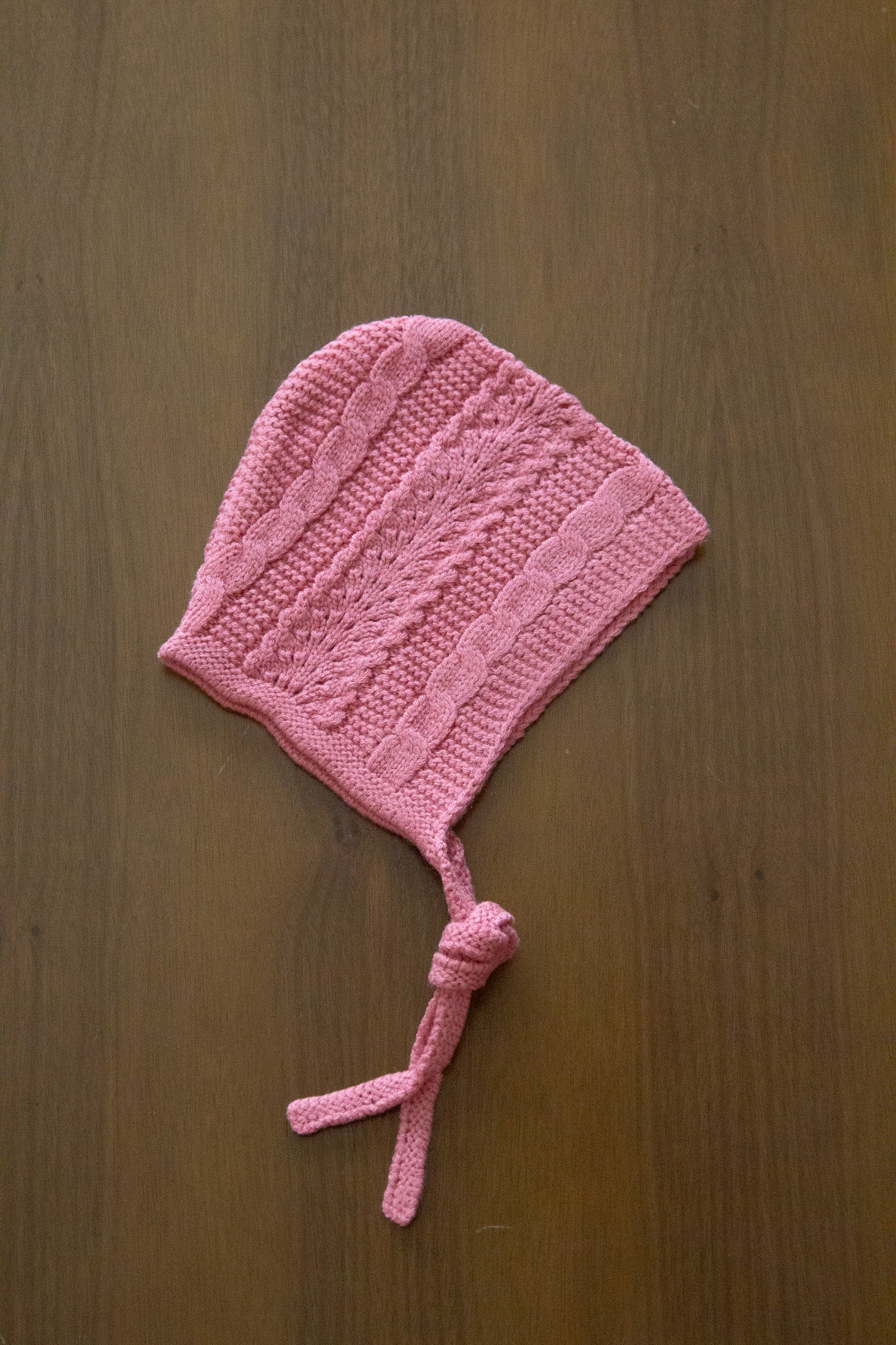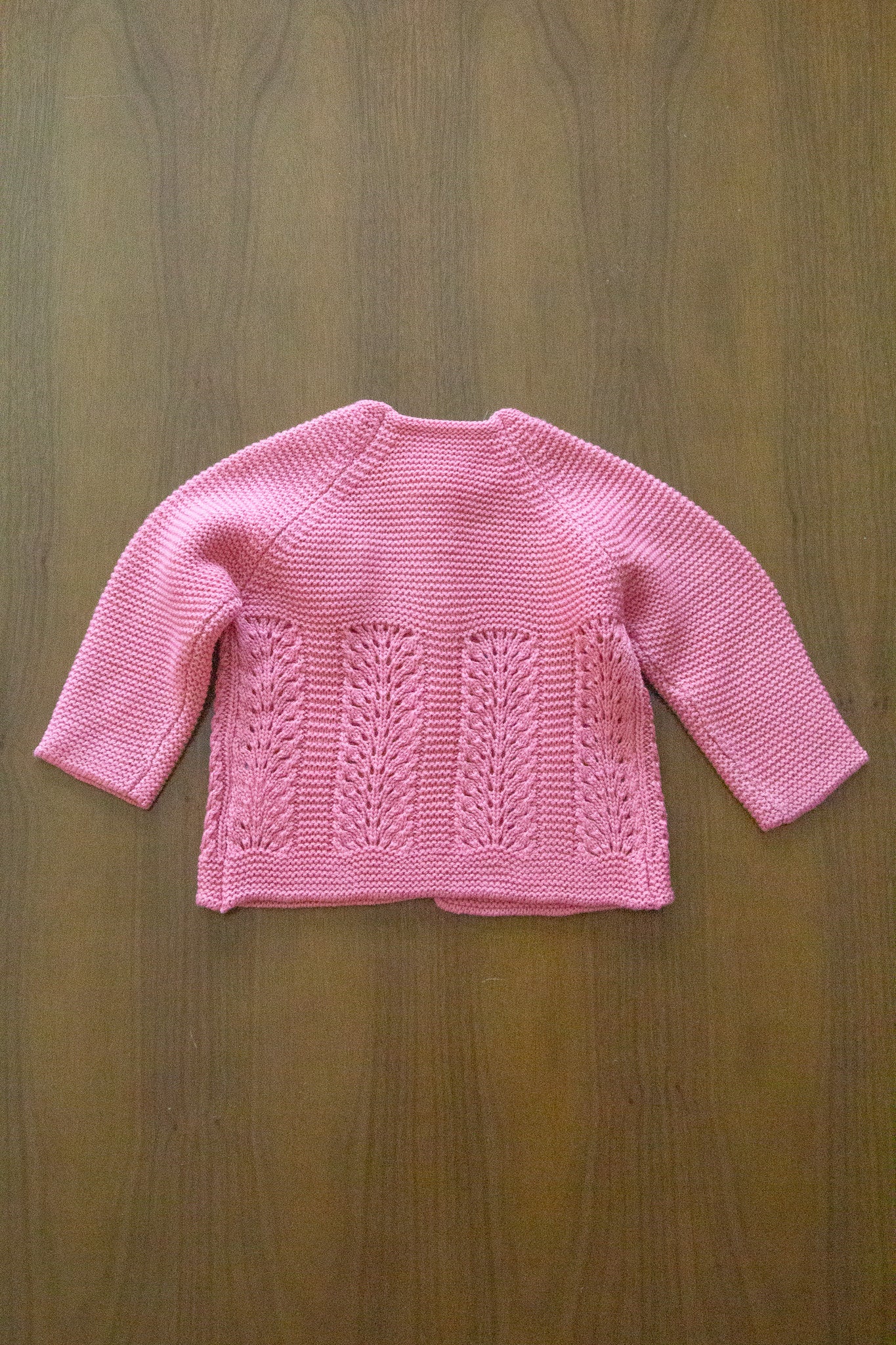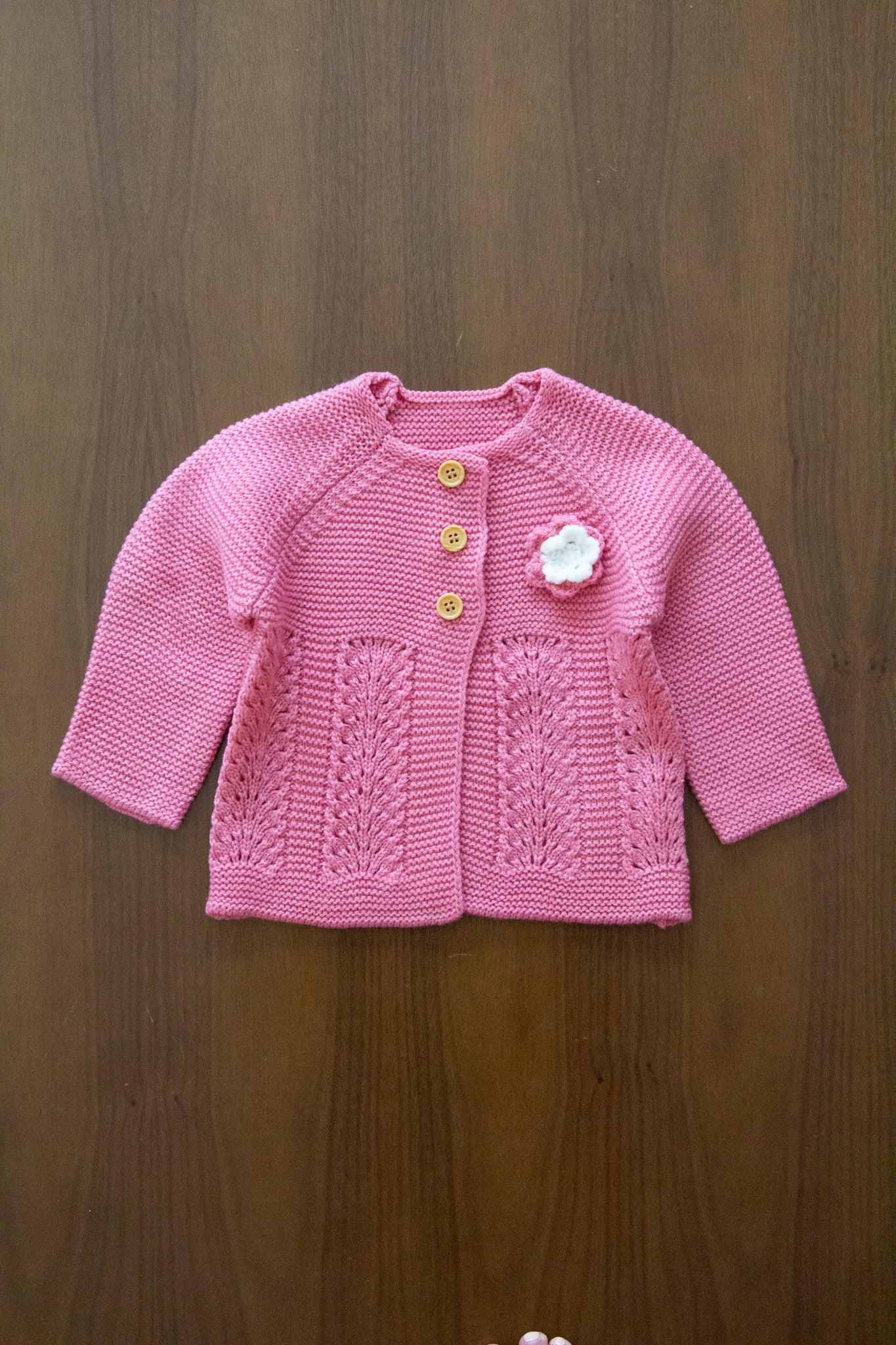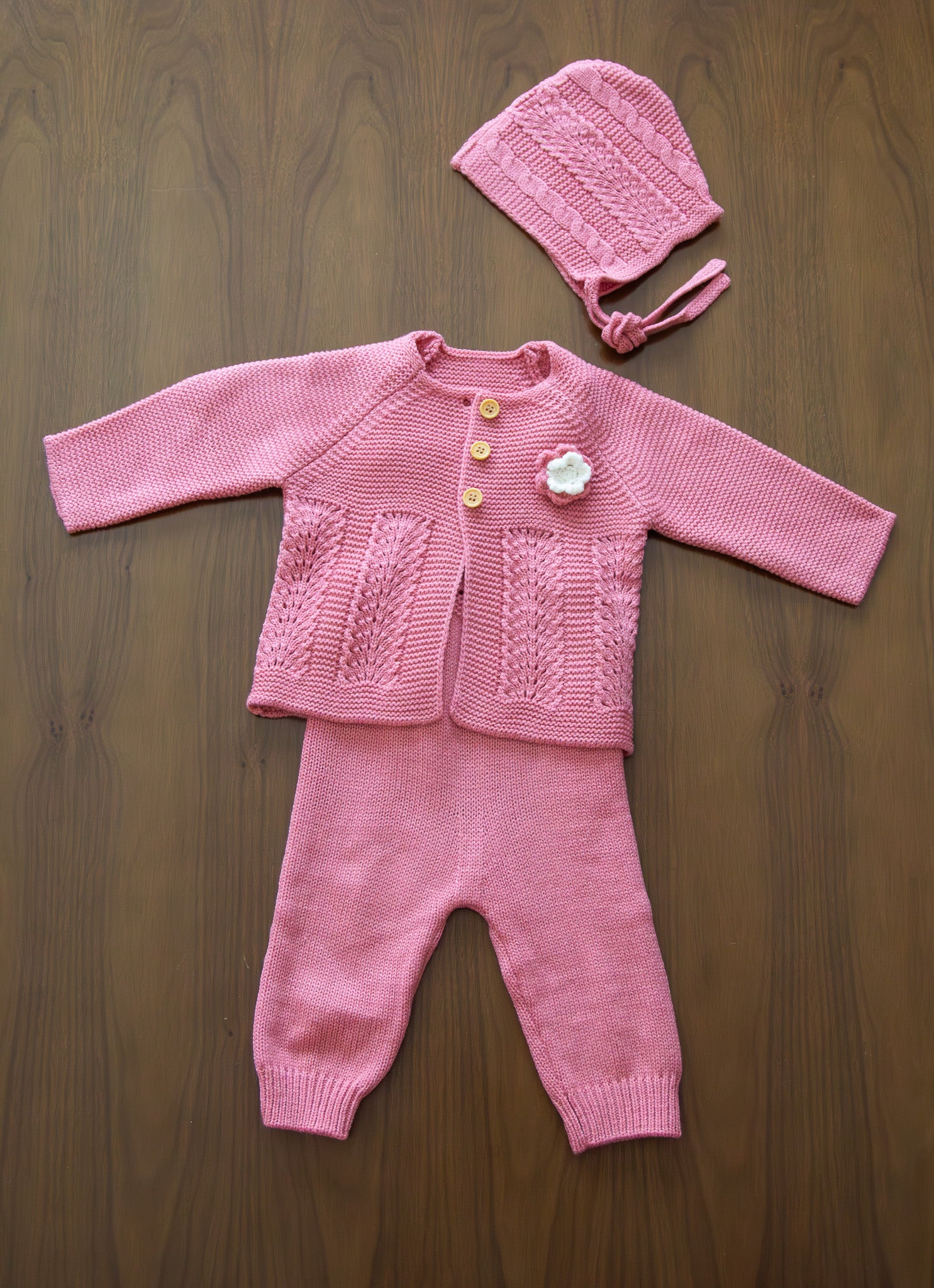 Conjunto de punto con cárdigan, peto y capota para niña